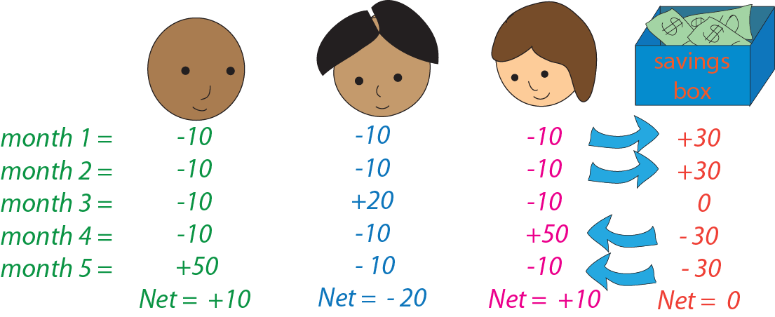 A group of people (neighbours, friends, family, etc.) pool their savings each week or month, usually in a common fund. They then take turns distributing the money from the fund, either as a payment to one of their members or as a loan (often with interest). This is a redistribution of each member’s savings among themselves, according to the rules established by the group. In the case of a loan with interest, the person paying the interest contributes more to the tontine than the others. There is a redistribution of money from borrowers to lenders.